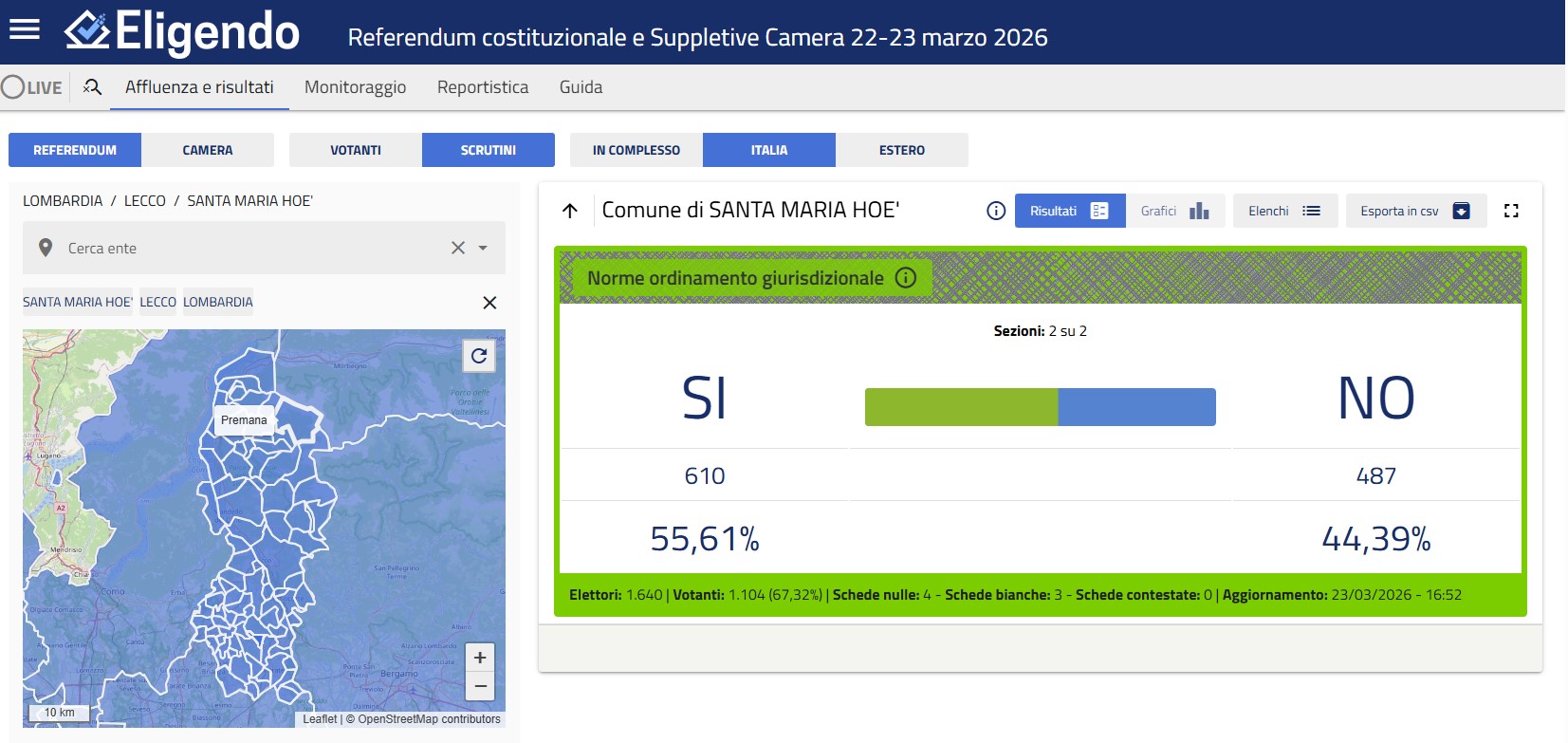 Si informa la cittadinanza che sono pubblicati i risultati del Referendum Costituzionale del 22 e 23 Marzo 2026, del Comune di Santa Maria Hoè (LC).